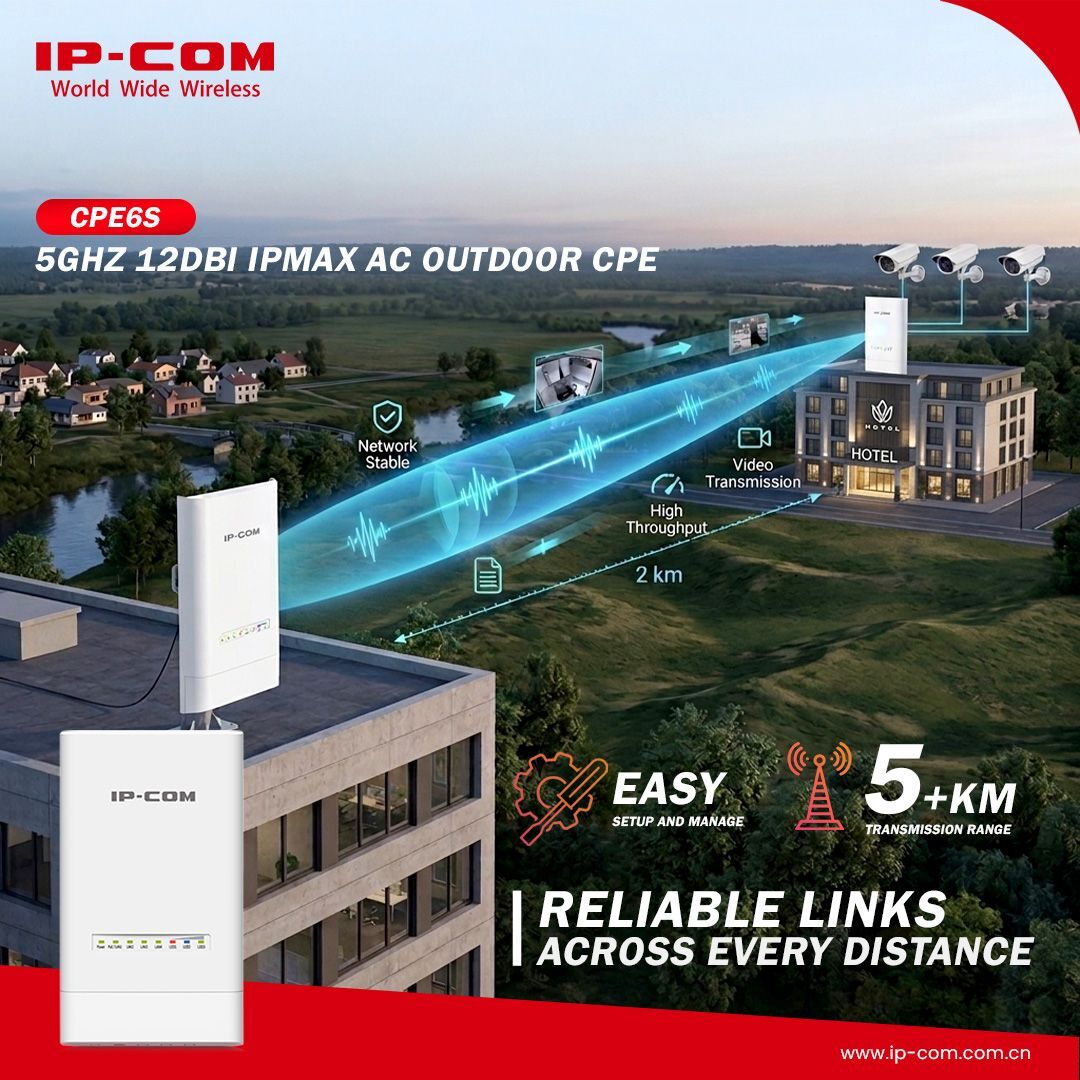 The IP-COM CPE6S is a powerful outdoor wireless access point operating on 5GHz with speeds up to 300Mbps, ideal for long-range network bridging and stable outdoor connectivity.